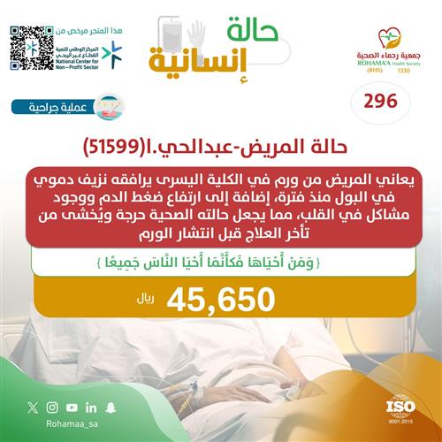 يعاني المريض من ورم في الكلية اليسرى يرافقه نزيف دموي في البول منذ فترة، إضافة إلى ارتفاع ضغط الدم ووجود مشاكل في القلب، مما يجعل حالته الصحية حرجة ويُخشى من تأخر العلاج قبل انتشار الورم