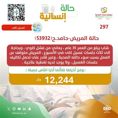 شاب يبلغ من العمر 35 عام ، يعاني من فشل كلوي ، وبحاجة الى ثلاث جلسات غسيل كلى في الأسبوع ، المريض متوقف عن العمل بسبب سوء حالته الصحية ، وغير قادر على تحمل تكاليف جلسات الغسيل ، ولا يوجد لديه تغطية علاجية .
