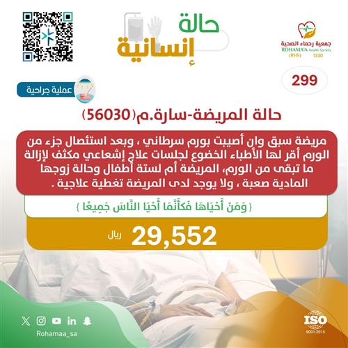 مريضة سبق وان أصيبت بورم سرطاني ، وبعد استئصال جزء من الورم أقر لها الأطباء الخضوع لجلسات علاج إشعاعي مكثف لإزالة ما تبقى من الورم، المريضة أم لستة أطفال وزوجها يعمل براتب زهيد ، وحالته المادية صعبة ، وغير قادر على تحمل تكاليف علاج زوجته ، ولا يوجد لدى المريضة تغطية علاجية .