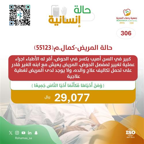 كبير في السن أصيب بكسر في الحوض، أقر له الأطباء اجراء عملية تغيير لمفصل الحوض، المريض يعيش مع ابنه الغير قادر على تحمل تكاليف علاج والده، ولا يوجد لدى المريض تغطية علاجية