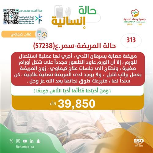مريضة مصابة بسرطان الثدي ، أجري لها عملية استئصال للورم ، إلا أن الورم عاود الظهور مجدداً على شكل أورام صغيرة ، وتحتاج الى جلسات علاج كيماوي ، زوج المريضة يعمل براتب قليل ، ولا يوجد لدى المريضة تغطية علاجية ، كن سنداً لها ، فتبرعك طوق نجاتها بعد الله عز وجل .